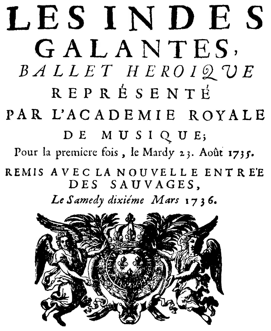 - Partition, édition 1736: « Les Indes Galantes, ballet, réduite à quatre grands concerts : avec une