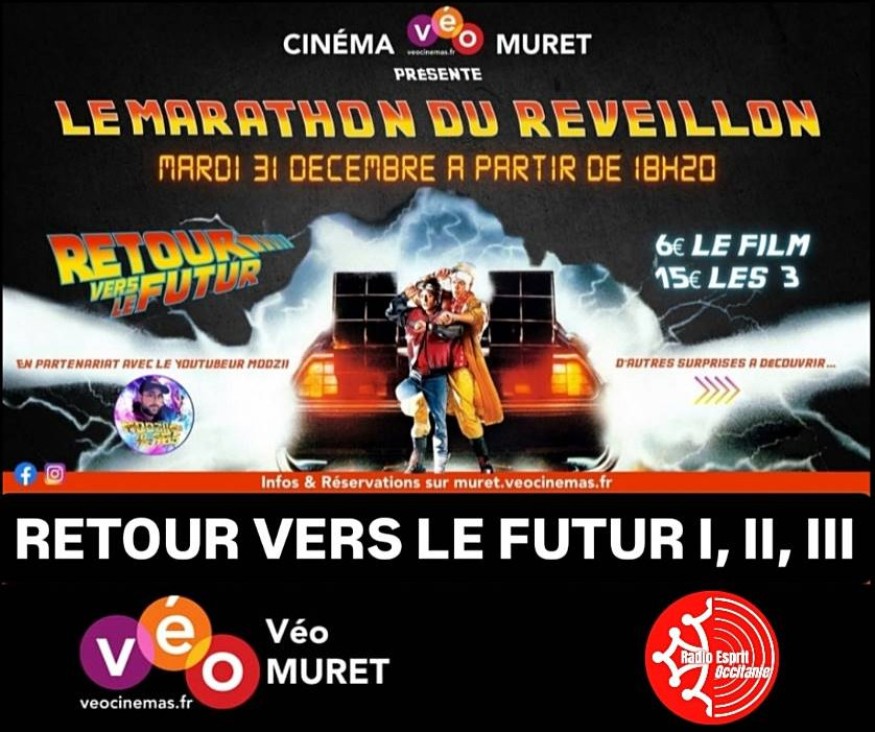 Pour le réveillon du 31 décembre le cinéma VEO de Muret vous propose le marathon de la trilogie Retour vers le futur de 18h20 jusqu'à l'année prochaine. Une soirée avec repas et l'univers de Retour vers le futur avec un quizz sur la saga. N'hésitez à réservez vos places pour cette soirée réveillon et passage en 2025 sous le signe du voyage dans le temps !